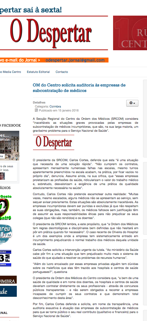 OM do Centro solicita auditoria às empresas de subcontratação de médicos