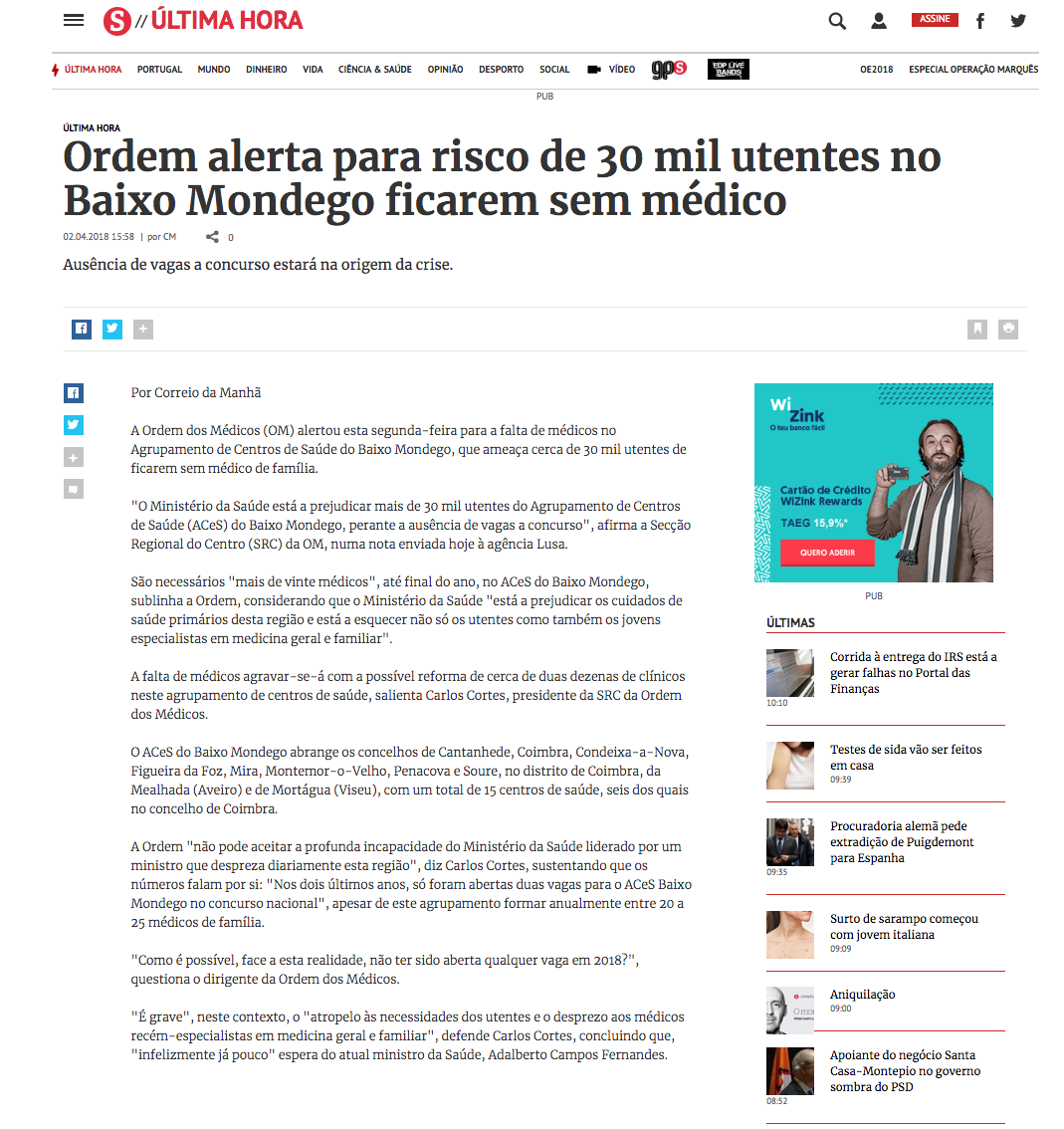 Ordem alerta para risco de 30 mil ficarem sem médicos no Baixo Mondego