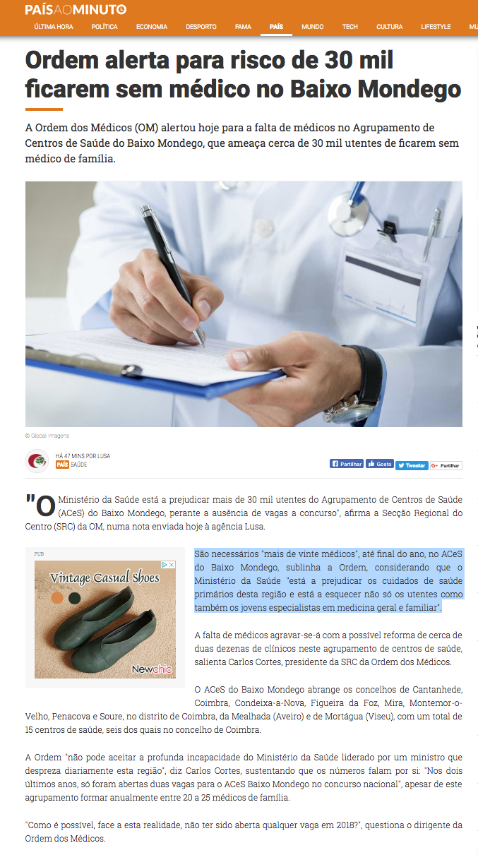 Ordem alerta para risco de 30 mil ficarem sem médicos no Baixo Mondego