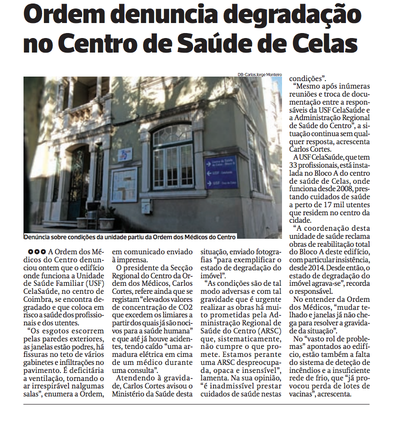 Ordem denuncia degradação no Centro de Saúde de Celas
