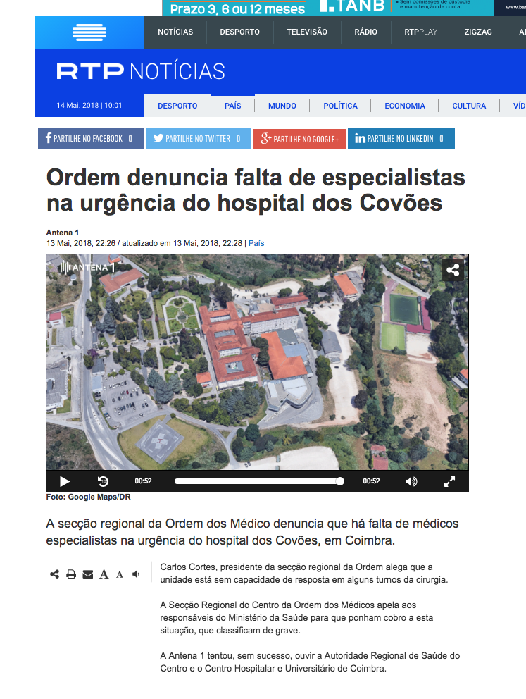 Ordem denuncia falta de especialistas na urgência do hospital dos Covões