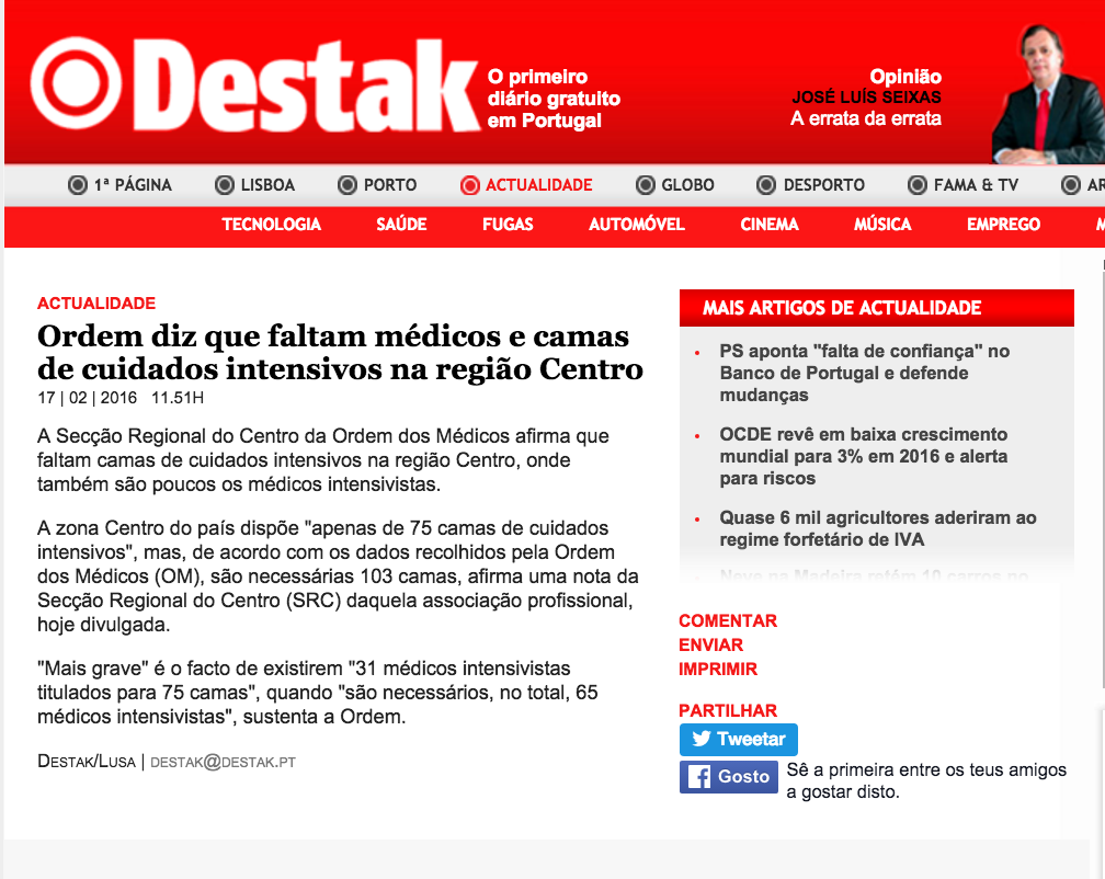 Ordem diz que faltam médicos e camas de cuidados intensivos na Região Centro