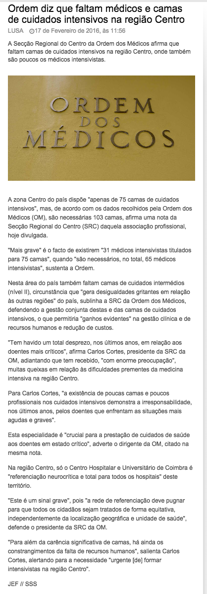 Ordem diz que faltam médicos e camas de cuidados intensivos na Região Centro