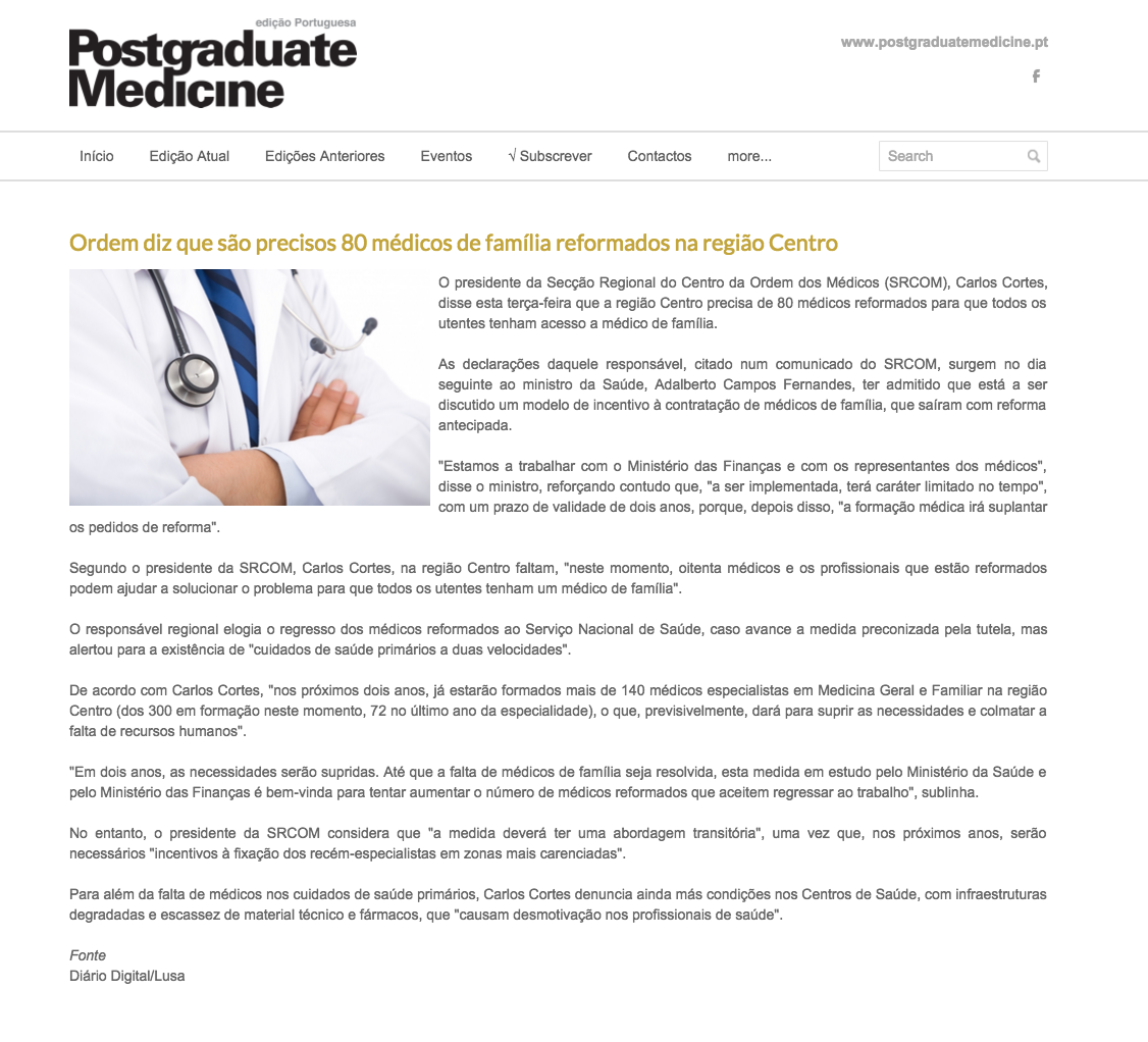 Ordem diz que são precisos 80 médicos de família reformados na região Centro
