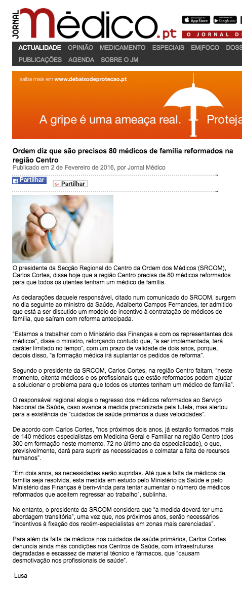Ordem diz que são precisos 80 médicos de família reformados na região Centro