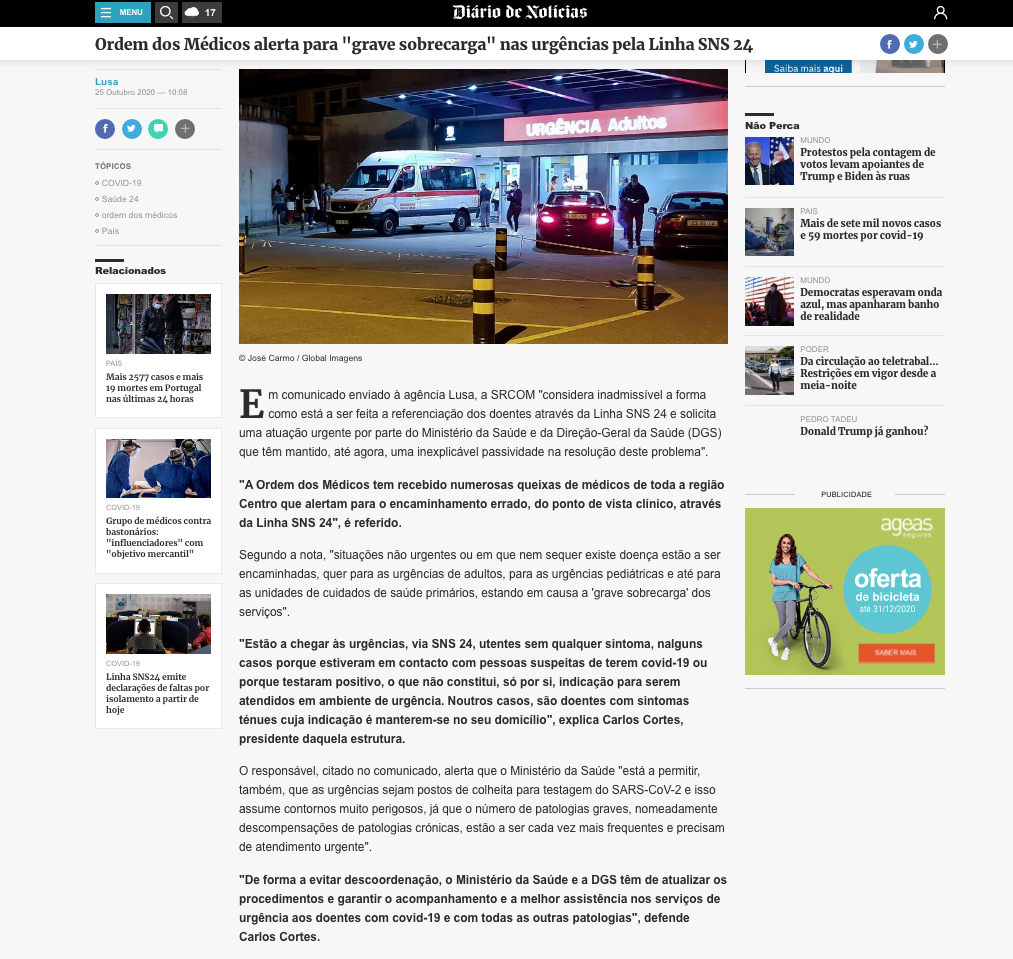 Ordem dos Médicos alerta para “grave sobrecarga” nas urgências pela Linha SNS 24