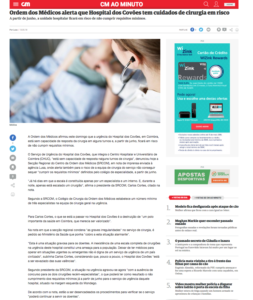 Ordem dos Médicos alerta que Hospital dos Covões tem cuidados de cirurgia em risco