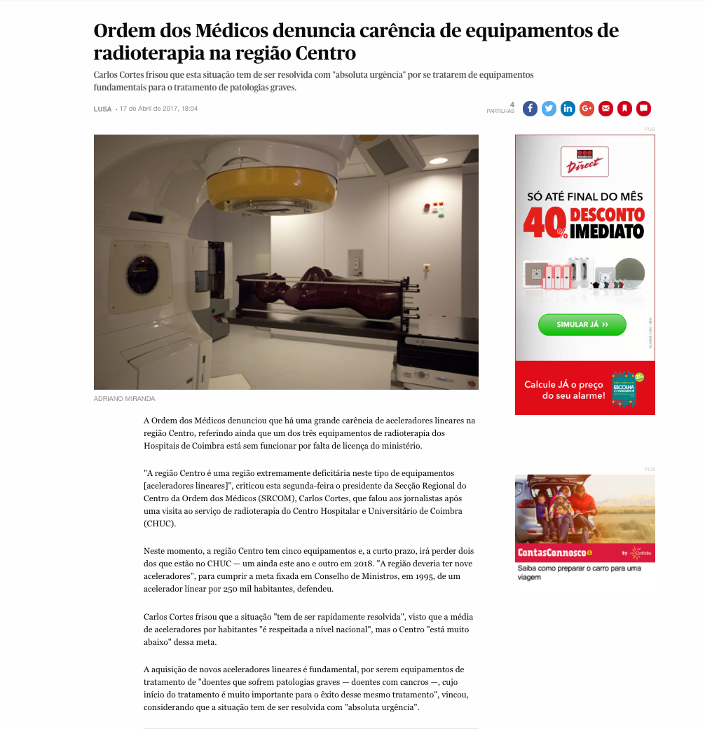 Ordem dos Médicos denuncia carência de equipamentos de radioterapia na região Centro