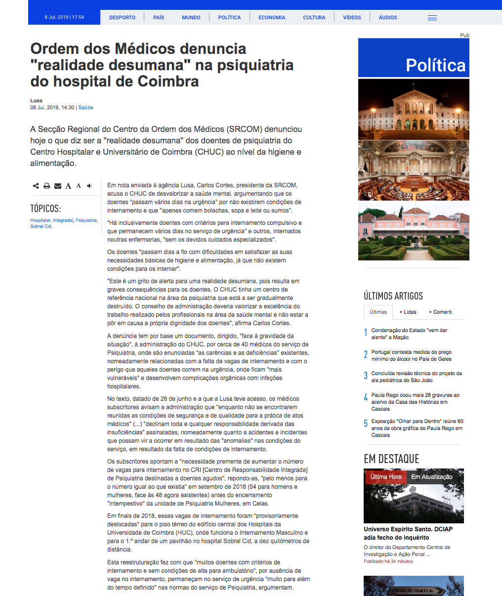 Ordem dos Médicos denuncia “realidade desumana” na psiquiatria do hospital de Coimbra
