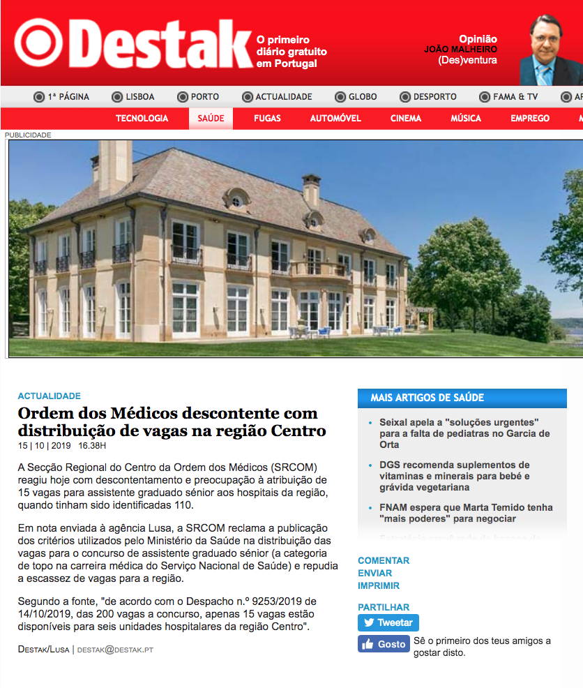 Ordem dos Médicos descontente com distribuição de vagas na Região Centro