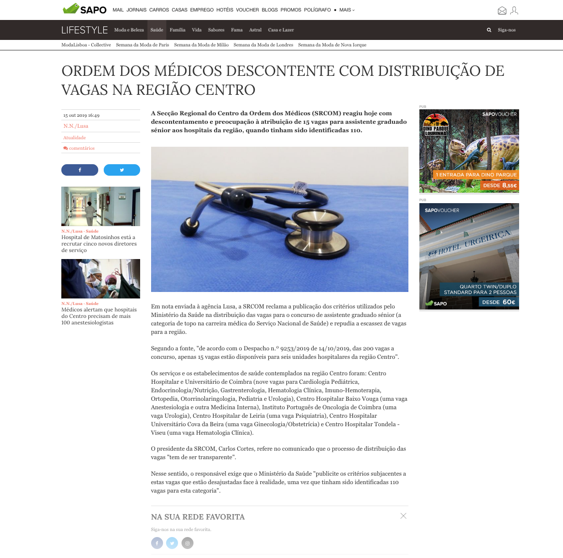 Ordem dos Médicos descontente com distribuição de vagas na Região Centro
