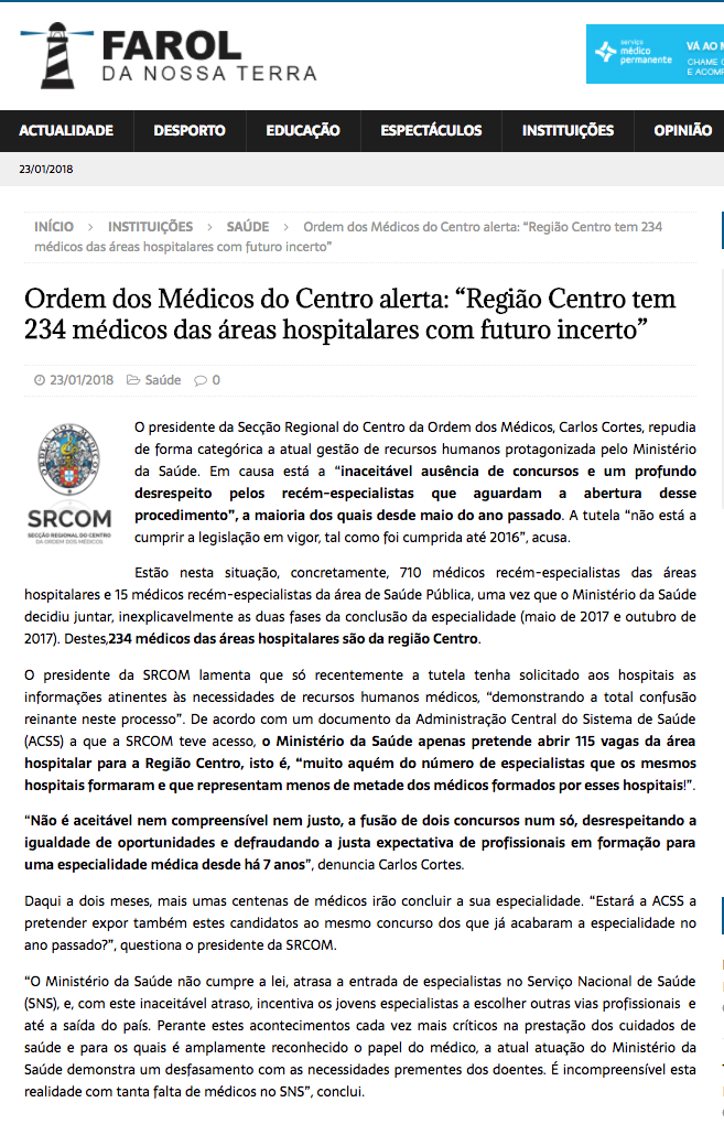Ordem dos Médicos do Centro alerta: “Região Centro tem 234 médicos das áreas hospitalares com futuro incerto”