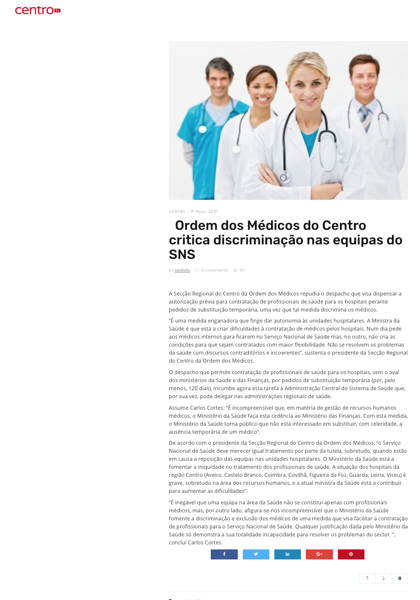 Ordem dos Médicos do Centro critica discriminação nas equipas do SNS