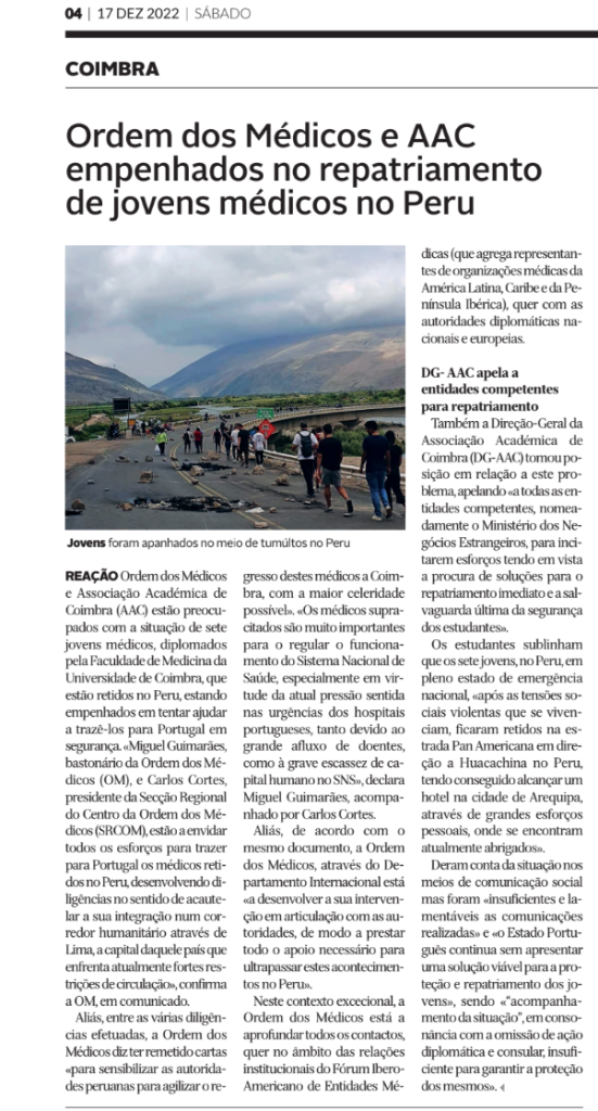 Ordem dos Médicos e AAC empenhados no repatriamento de jovens médicos no Peru