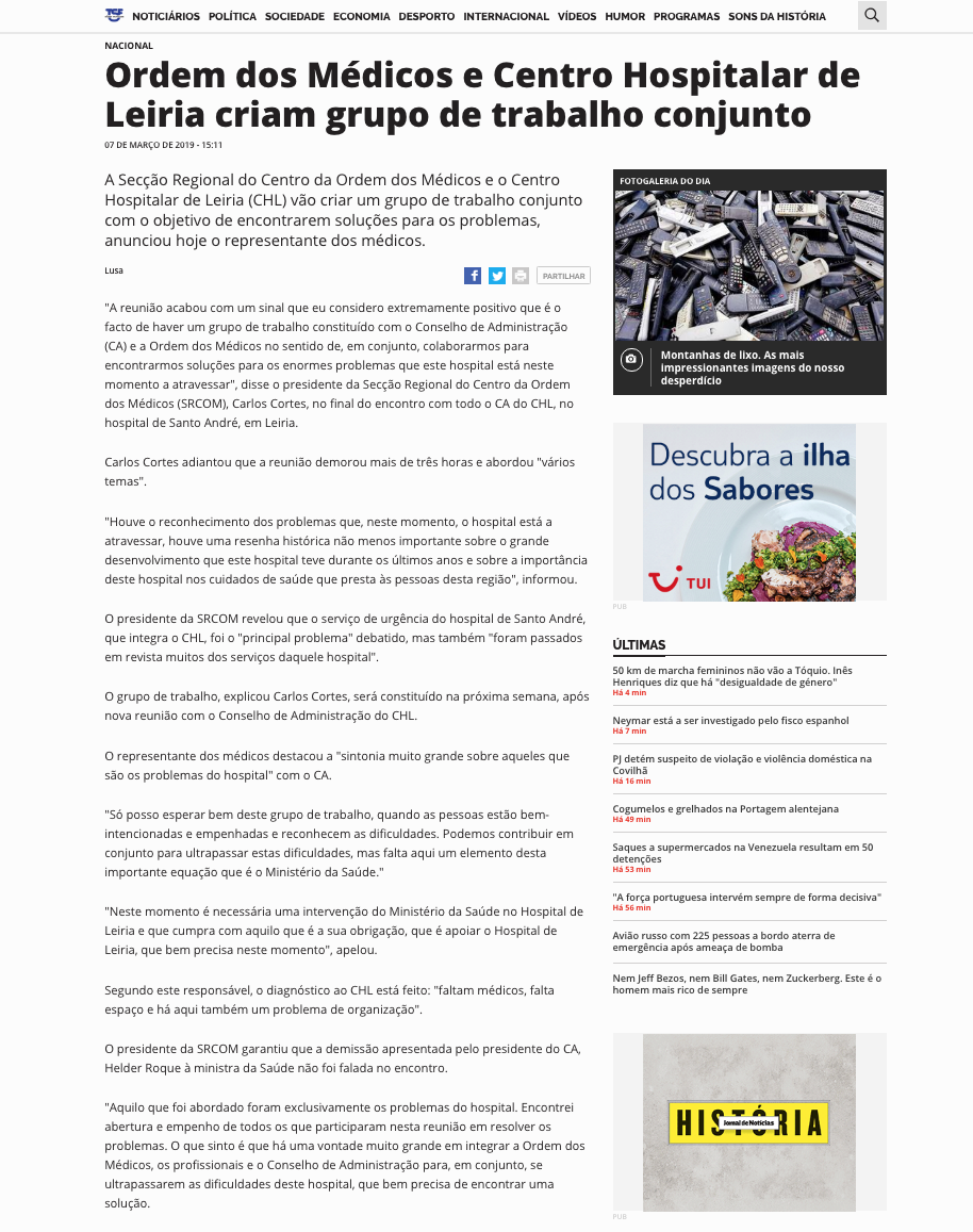 Ordem dos Médicos e Centro Hospitalar de Leiria criam grupo de trabalho conjunto