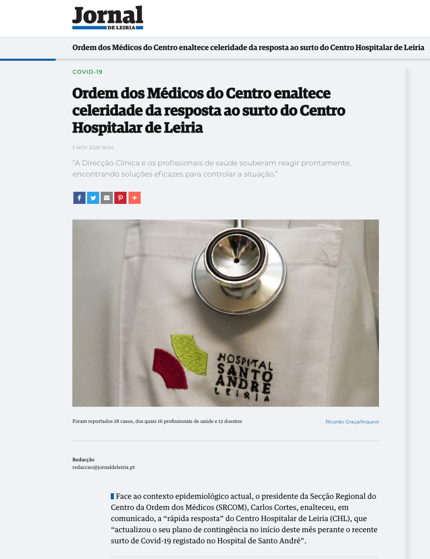 Ordem dos Médicos enaltece celeridade da resposta ao surto do Centro Hospitalar de Leiria