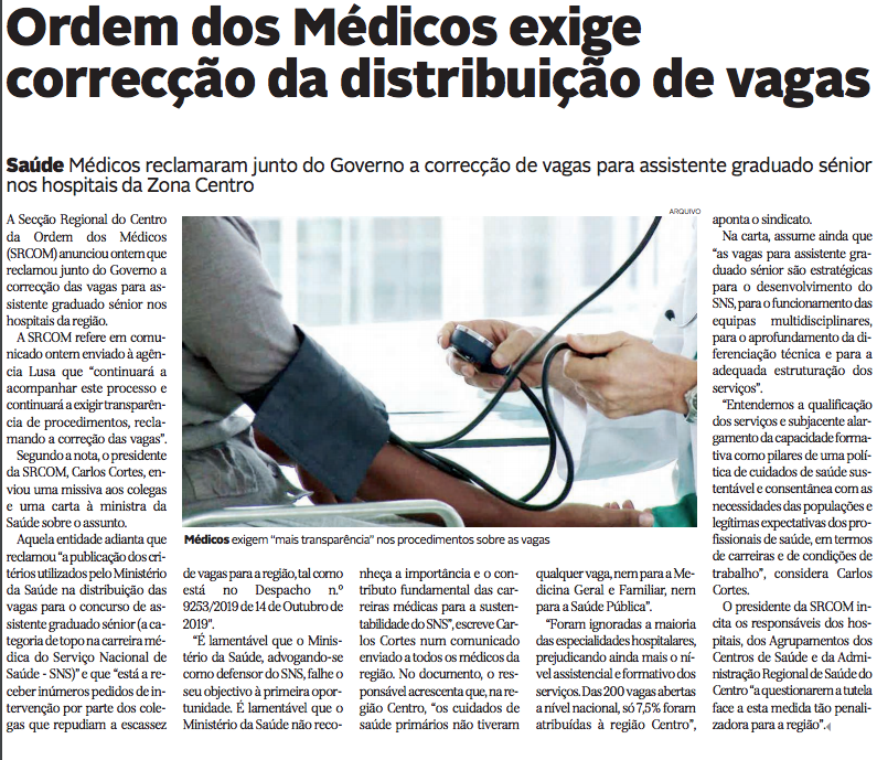Ordem dos Médicos exige correção da distribuição de vagas na região Centro