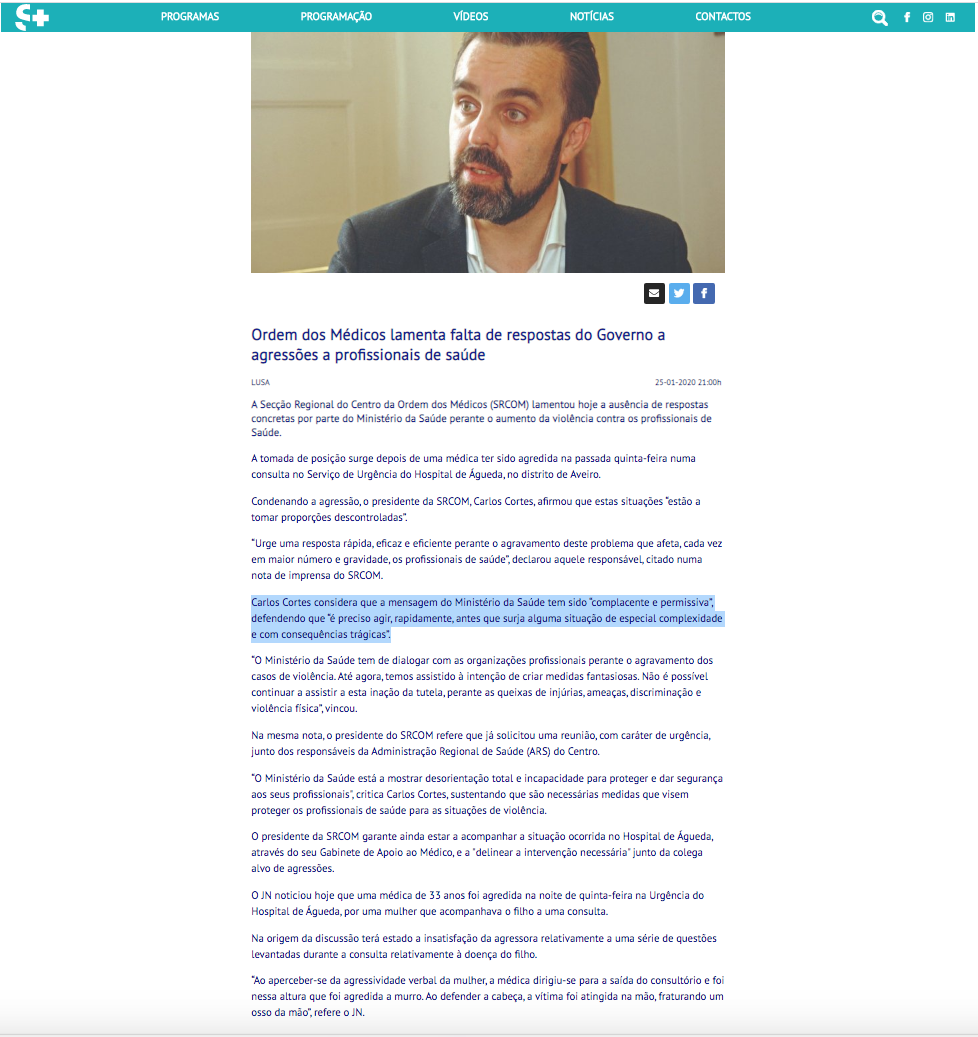 Ordem dos Médicos lamenta falta de respostas do Governo a agressões a profissionais de saúde