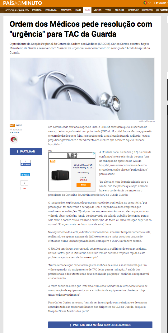 Ordem dos Médicos pede resolução com “caráter de urgência” para TAC da Guarda
