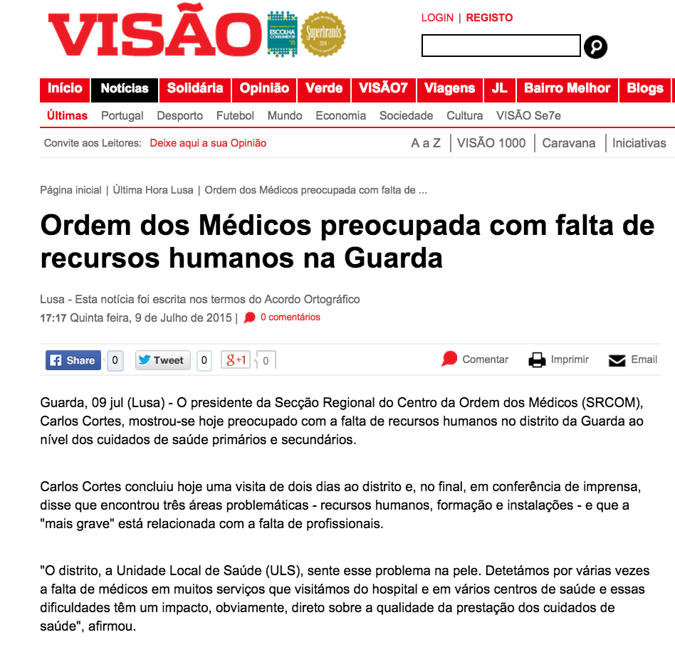 Ordem dos Médicos preocupada com falta de recursos humanos na Guarda
