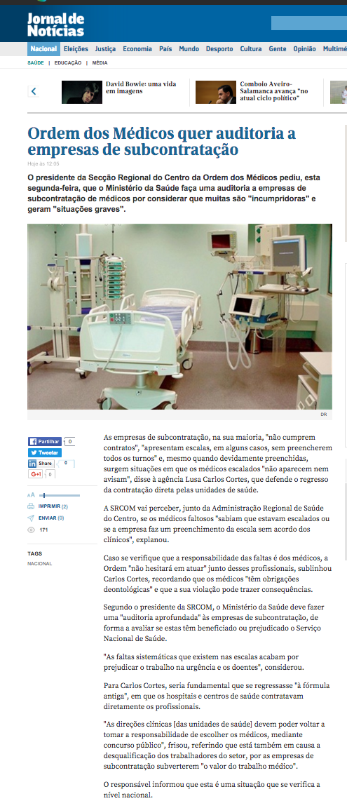 Ordem dos Médicos quer auditoria a empresas de subcontratação