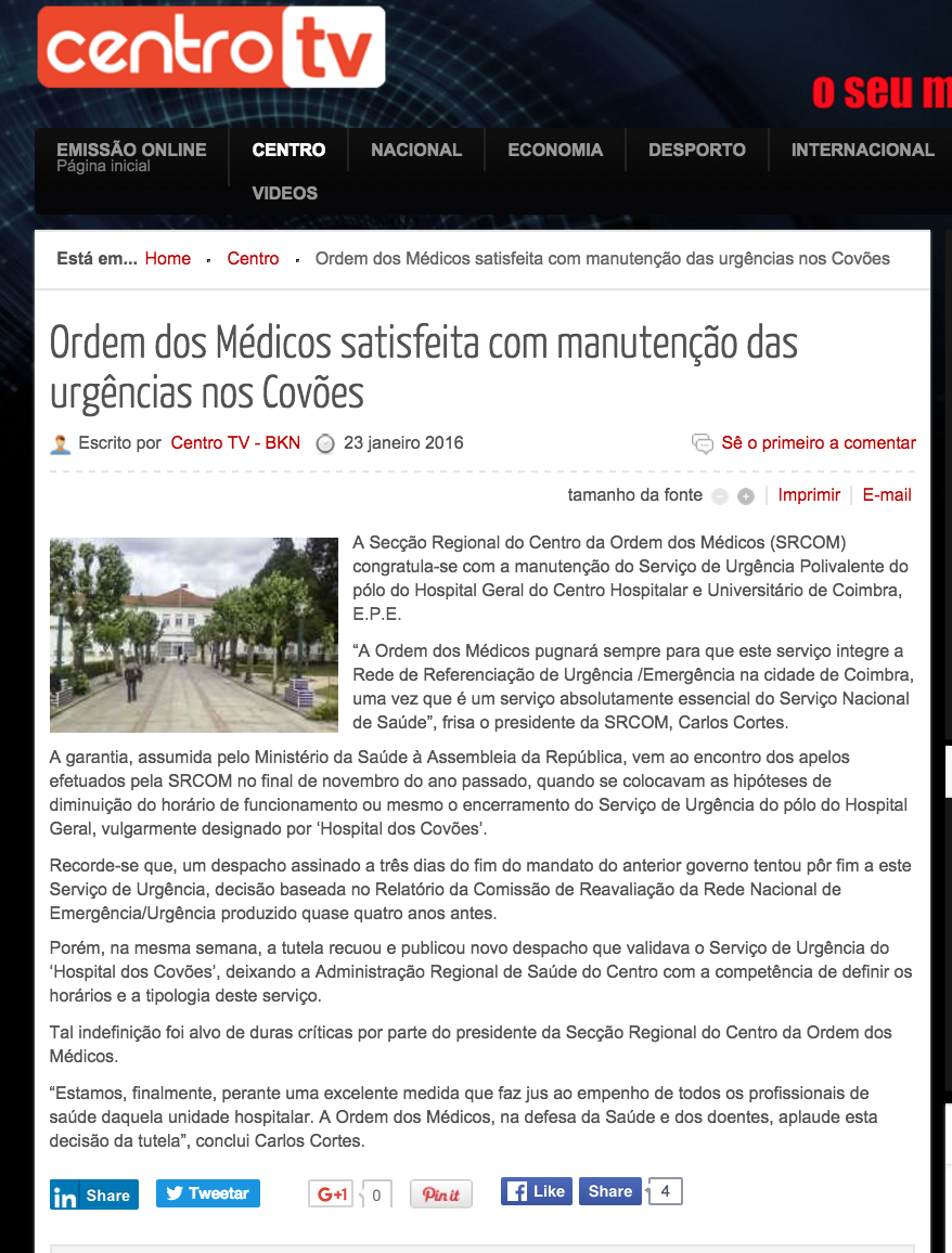 Ordem dos Médicos satisfeita com manutenção das urgências dos Covões