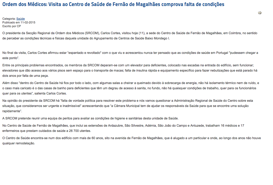 Ordem dos Médicos: Visita ao centro de saúde de Fernão de Magalhães comprova falta de condições