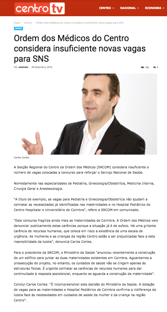 Ordem dosd Médicos do Centro considera insuficiente novas vagas para SNS