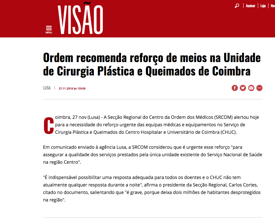 Ordem recomenda reforço de meios na Unidade de Cirurgia Plástica e Queimados do CHUC
