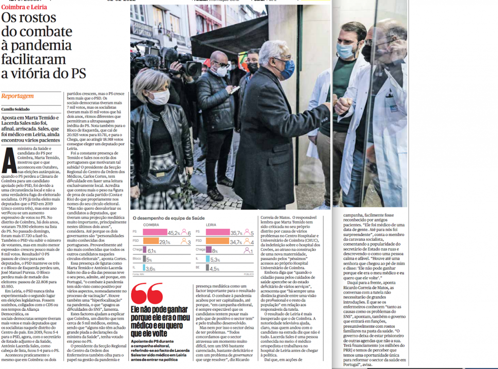 Foi a constante presença de Temido e Sales nos ecrãs dos portugueses que motivaram tal subida? O presidente da Secção Regional do Centro da Ordem dos Médicos, Carlos Cortes, tem dificuldade em fazer uma leitura exclusivamente local. Acredita que contou mais o peso na figura de proa de cada partido (Costa e Rio) do que propriamente nos nomes do seu círculo eleitoral.