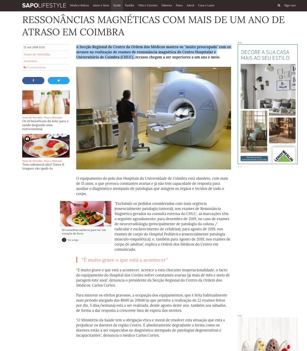 Ressonâncias Magnéticas com mais de um ano de atraso em Coimbra
