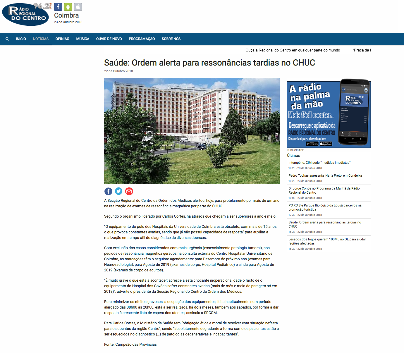 Saúde: Ordem alerta para ressonâncias tardias no CHUC