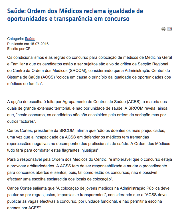Saúde: Ordem dos Médicos reclama igualdade de oportunidades e transparência em concurso