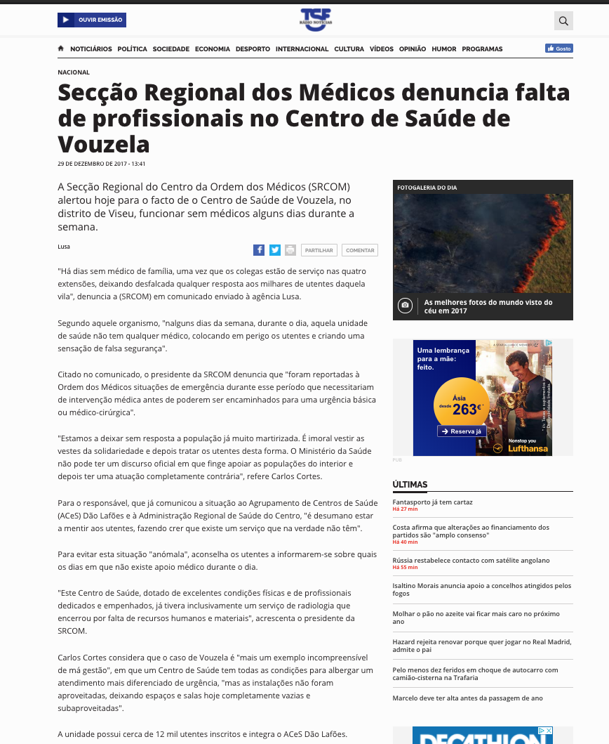 Secção Regional do Centro da Ordem dos Médicos denuncia falta de profissionais no Centro de Saúde de Vouzela