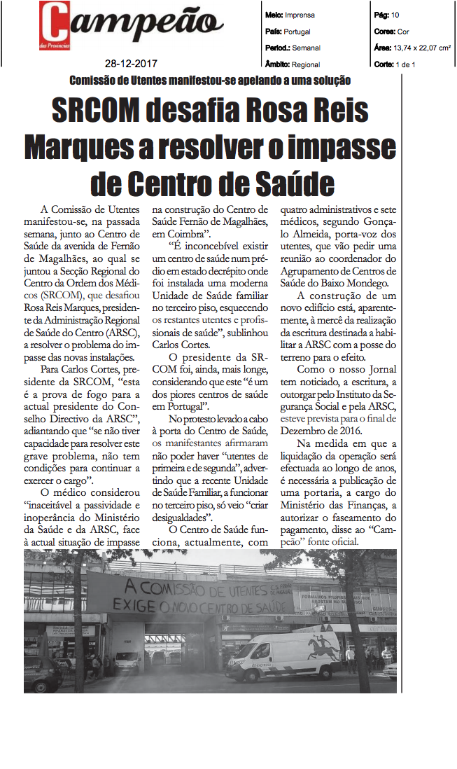 SRCOM desafia Rosa Reis Marques a resolver o impasse de Centro de Saúde