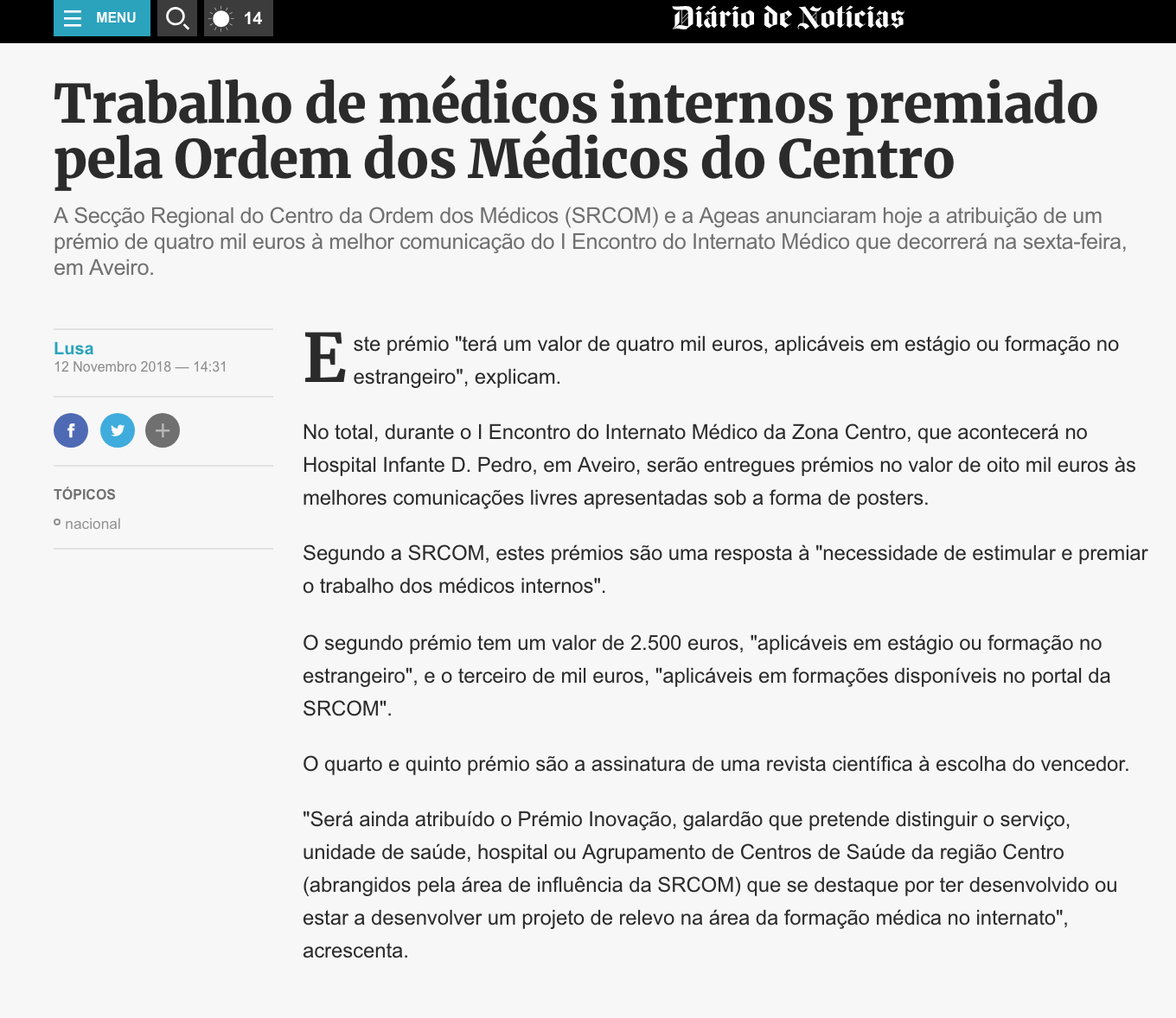 Trabalho de médicos internos premiado pela Ordem dos Médicos do Centro