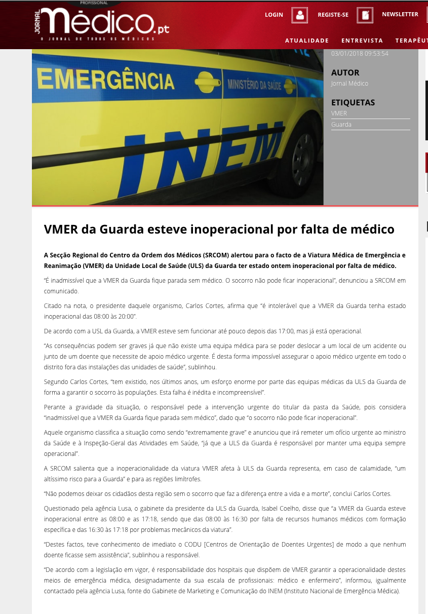VMER da Guarda esteve hoje inoperacional por falta de médico