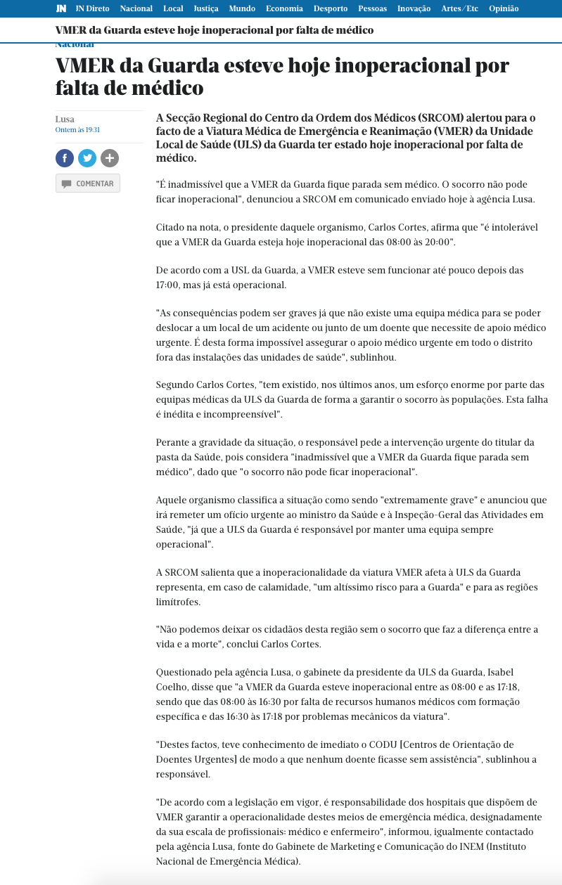 VMER da Guarda esteve hoje inoperacional por falta de médico